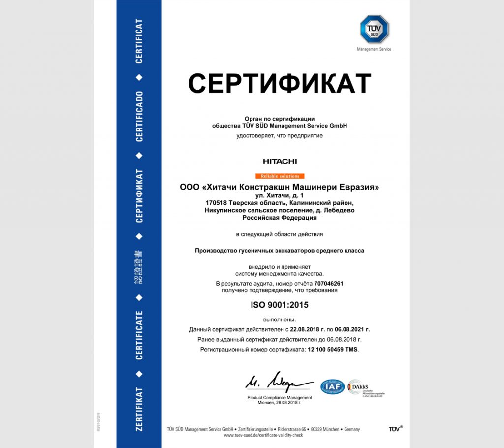 Начиная с 2015 года, завод успешно проходит ежегодную сертификацию ISO. Получено подтверждение, что Система менеджмента на предприятии соответствует требованиям ISO 9001 : 2015 и 45001 : 2018. Подобные сертификаты имеются у всех заводов Хитачи в мире, что подтверждает высокий уровень безопасности труда и обеспечения качества продукции.